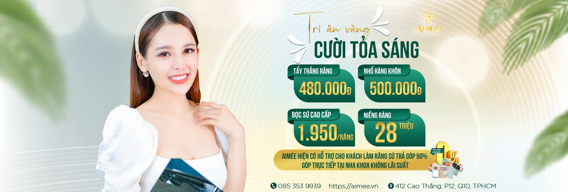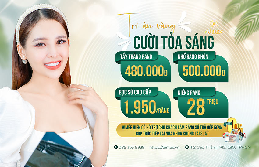 Tự hào là trung tâm chăm sóc nụ cười uy tín bậc nhất tại Thành phố Hồ Chí Minh. Aimee Nha khoa & Thẩm mỹ. Đi đầu trong lĩnh vực phục hình răng sứ với sự hỗ trợ của hệ thống phòng nha hiện đại được đầu tư máy móc, công nghệ nhập khẩu trực tiếp từ châu Âu. Bằng sự đánh giá và phân tích kỹ lưỡng, công nghệ Smile Designs giúp các chuyên gia Aimée thiết kế một nụ cười hoàn mỹ tôn vinh vẻ đẹp Á Đông, là chìa khóa mở cánh cửa thành công và hạnh phúc.