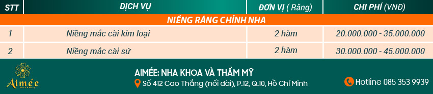 Khi đến với Aimée Dentist & Beauty bạn sẽ được các bác sĩ chuyên gia tận tâm thăm khám đưa ra hướng thực hiện và hướng dẫn lựa chọn loại mắc cài phù hợp. Lựa chọn niềng răng chỉnh nha tại Aimée chi phí phải chăng ngoài ra còn hỗ trợ trả góp phù hợp cho các bạn học sinh sinh viên